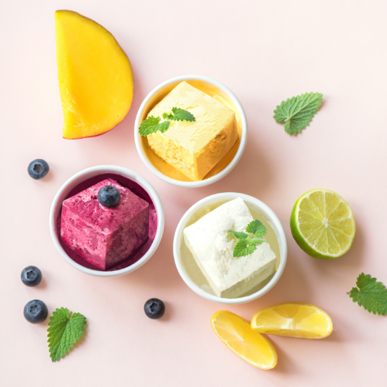 当店では厳選した旬の果物のおいしさをそのままジェラートに仕上げました。風味が濃厚でありながら、甘さ控えめでヘルシーなキューブジェラートをご堪能ください。